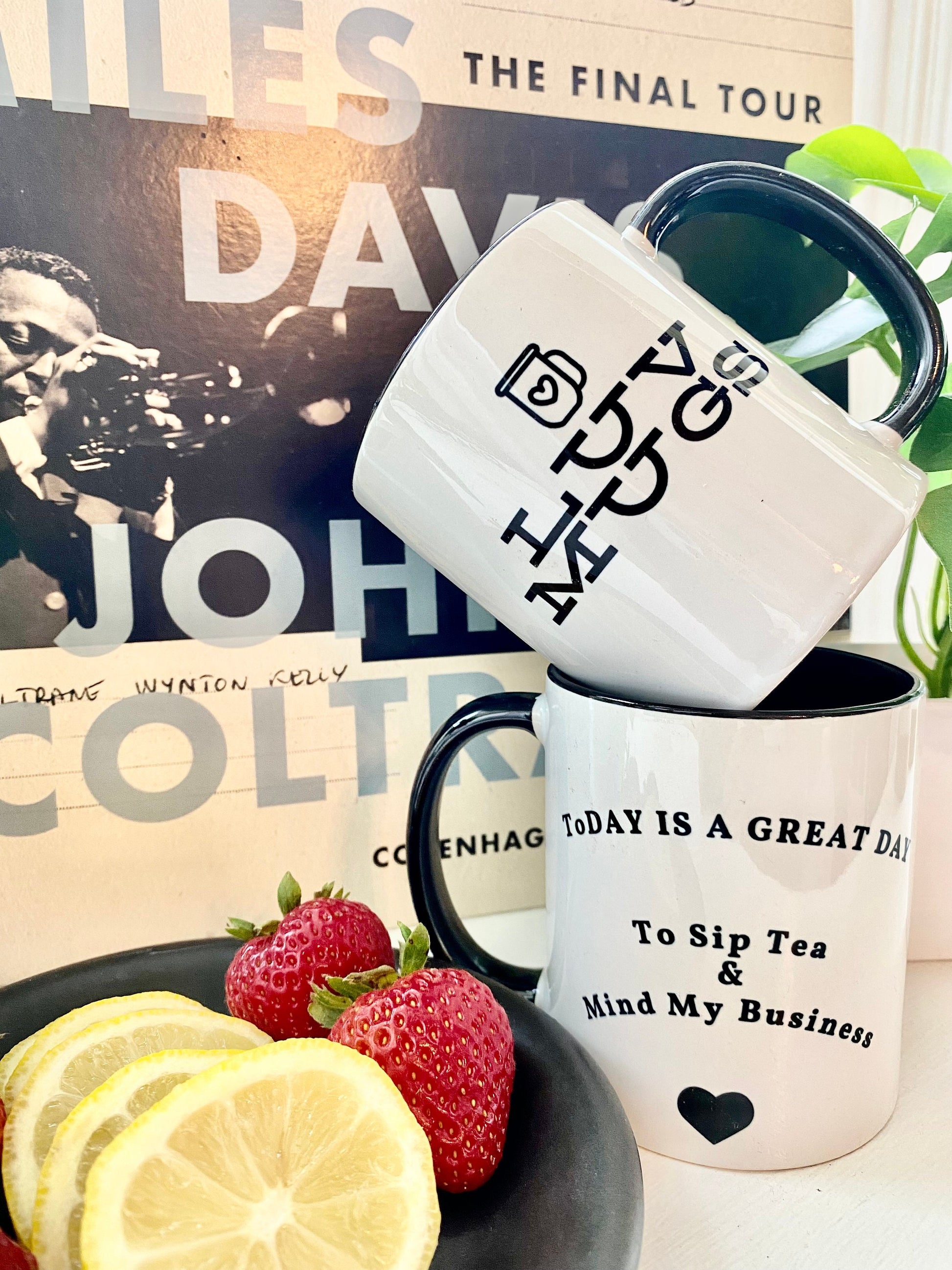 - 11 oz. White Ceramic Mug with Black Color Inside and on Handle with quote "Today Is A Great Day To Sip Tea & Mind My Business"